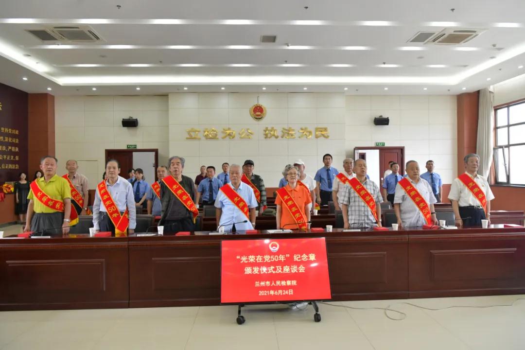 6月24日,兰州市检察院举行“光荣在党50年”纪念章颁发仪式及座谈会。市检察院党组成员、政治部主任周永麟为2021年7月1日前党龄达到50周年的22名党员同志颁发了纪念章,并代表市检察院党组和全体检察人员向授领纪念章的党员同志致以了崇高的敬意。市检察院机关党委专职副书记张学禄带领全体党员重温入党誓词、重忆入党初心。