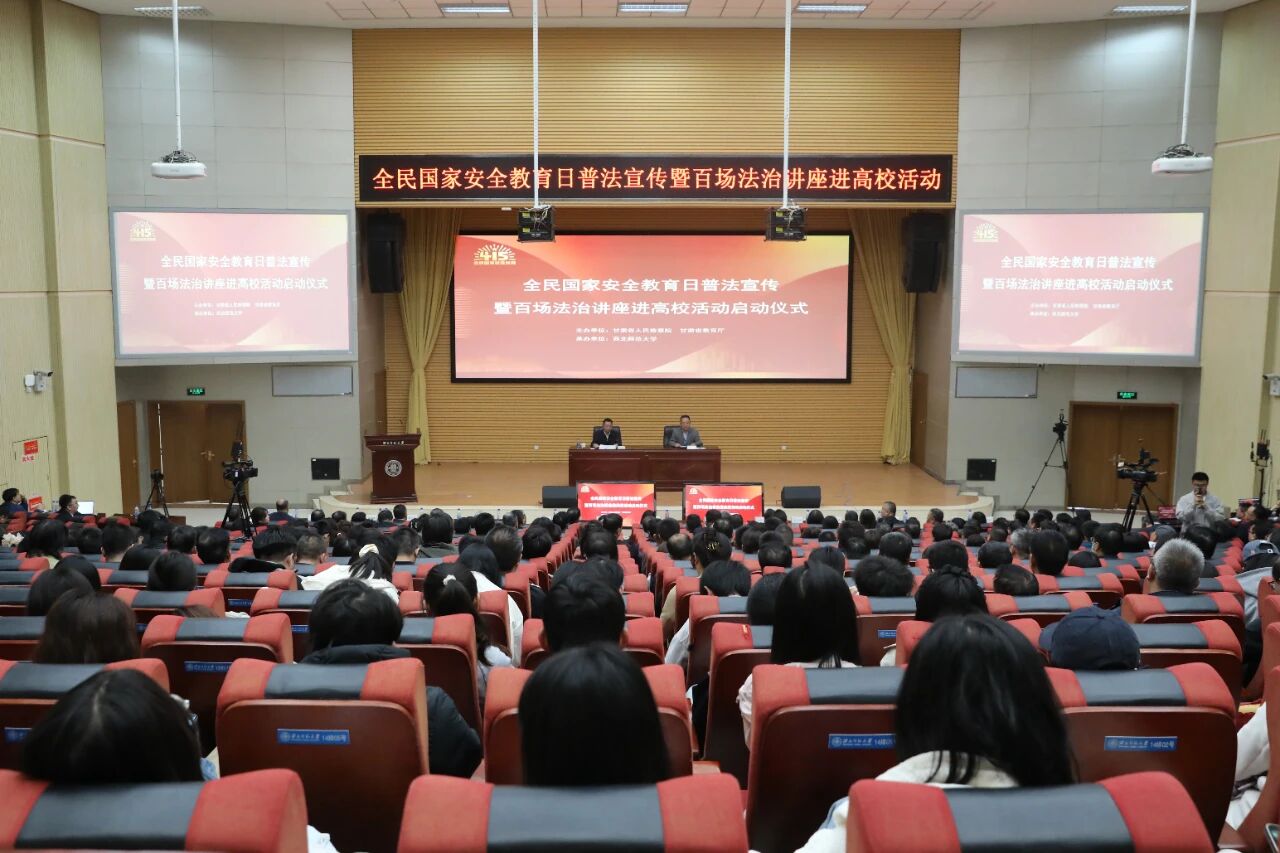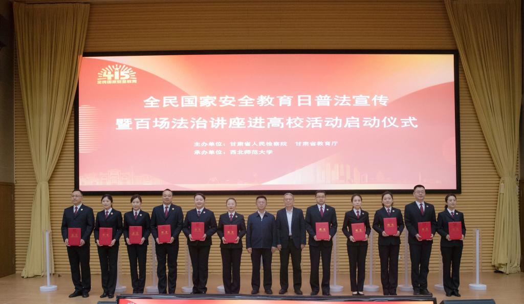 、省教育厅联合举办的全民国家安全教育日普法宣传暨百场法治讲座进高校活动在西北师范大学正式启动,省检察院党组书记、检察长沈涧出席启动仪式并作首场讲座;省检察院党组副书记、副检察长柳小惠主持启动仪式;省委教育工委委员、省教育厅党组成员、副厅长曾华辉致辞;省委政法委一级巡视员、省法学会党组书记韩世峰,兰州市检察院党组书记、检察长李郁军,省委宣传部二级巡视员谢青民,省司法厅二级巡视员王永平以及省内7所高校领导应邀出席仪式,11名检察干警受聘担任此次活动法治宣讲员。