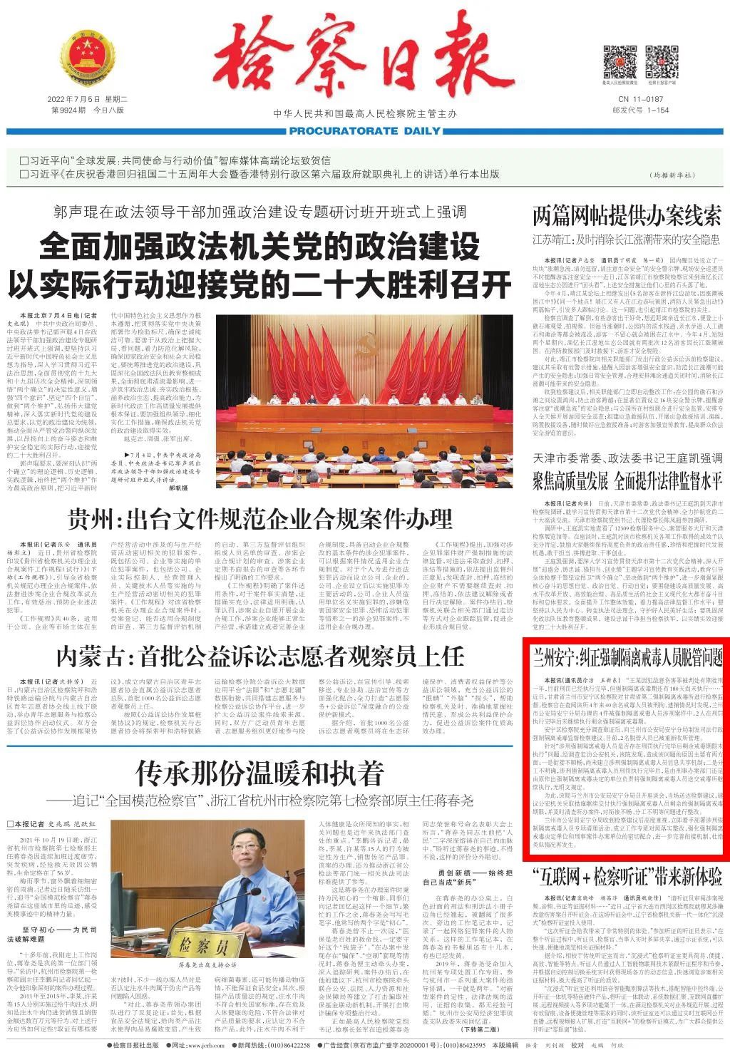 2022年7月5日,检察日报头版刊发《兰州安宁:纠正强制隔离戒毒人员脱管问题》。