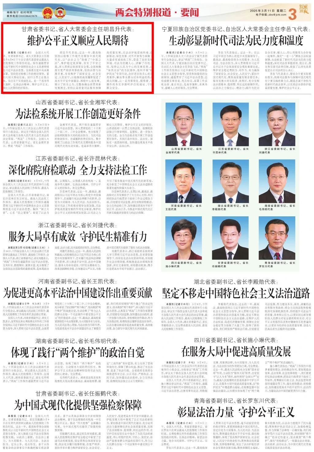 2025年3月11日,检察日报头版《两会特别报道·要闻》专栏刊发《甘肃省委书记、省人大常委会主任胡昌升代表:维护公平正义顺应人民期待》。