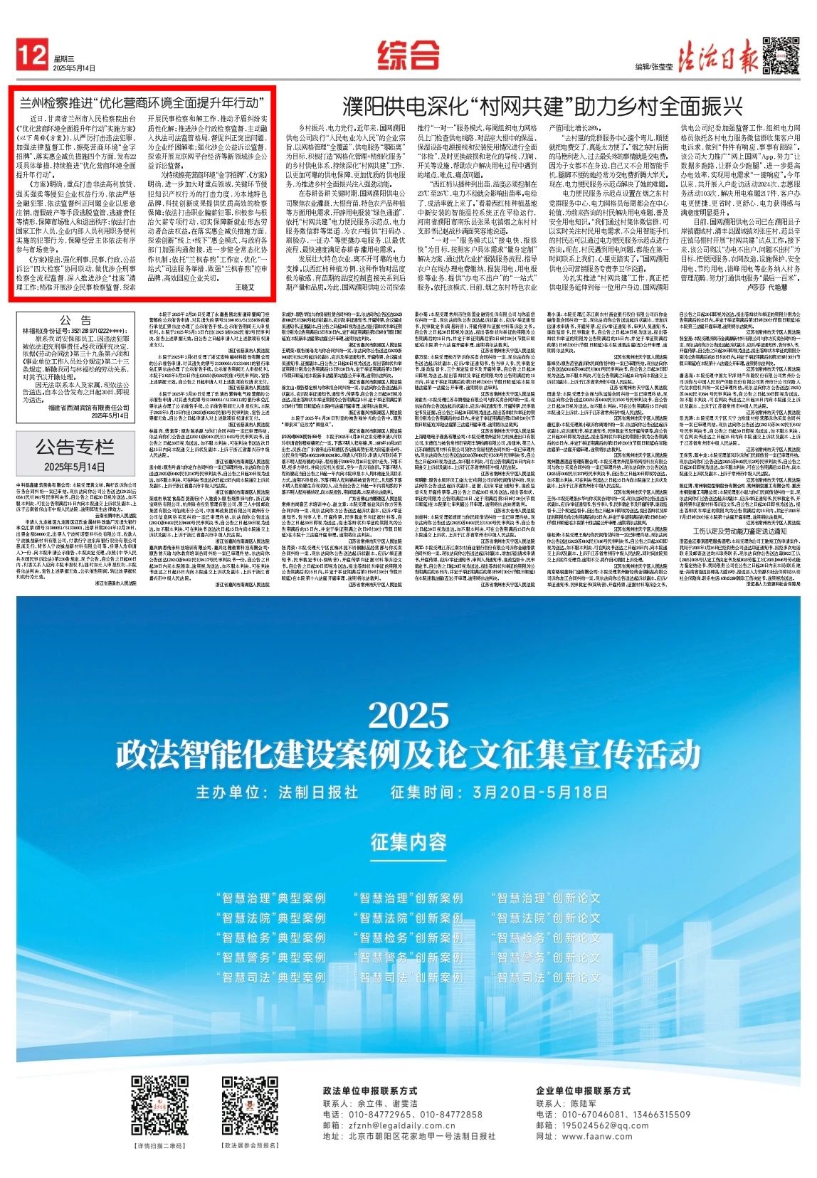 2025年5月14日,法治日报刊发《兰州检察推进“优化营商环境全面提升年行动”》。