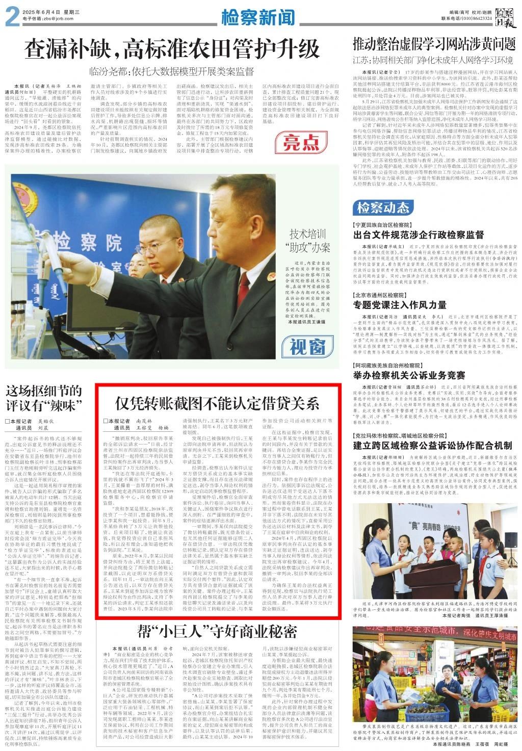 2025年6月4日,检察日报刊发《仅凭转账截图不能认定借贷关系》。