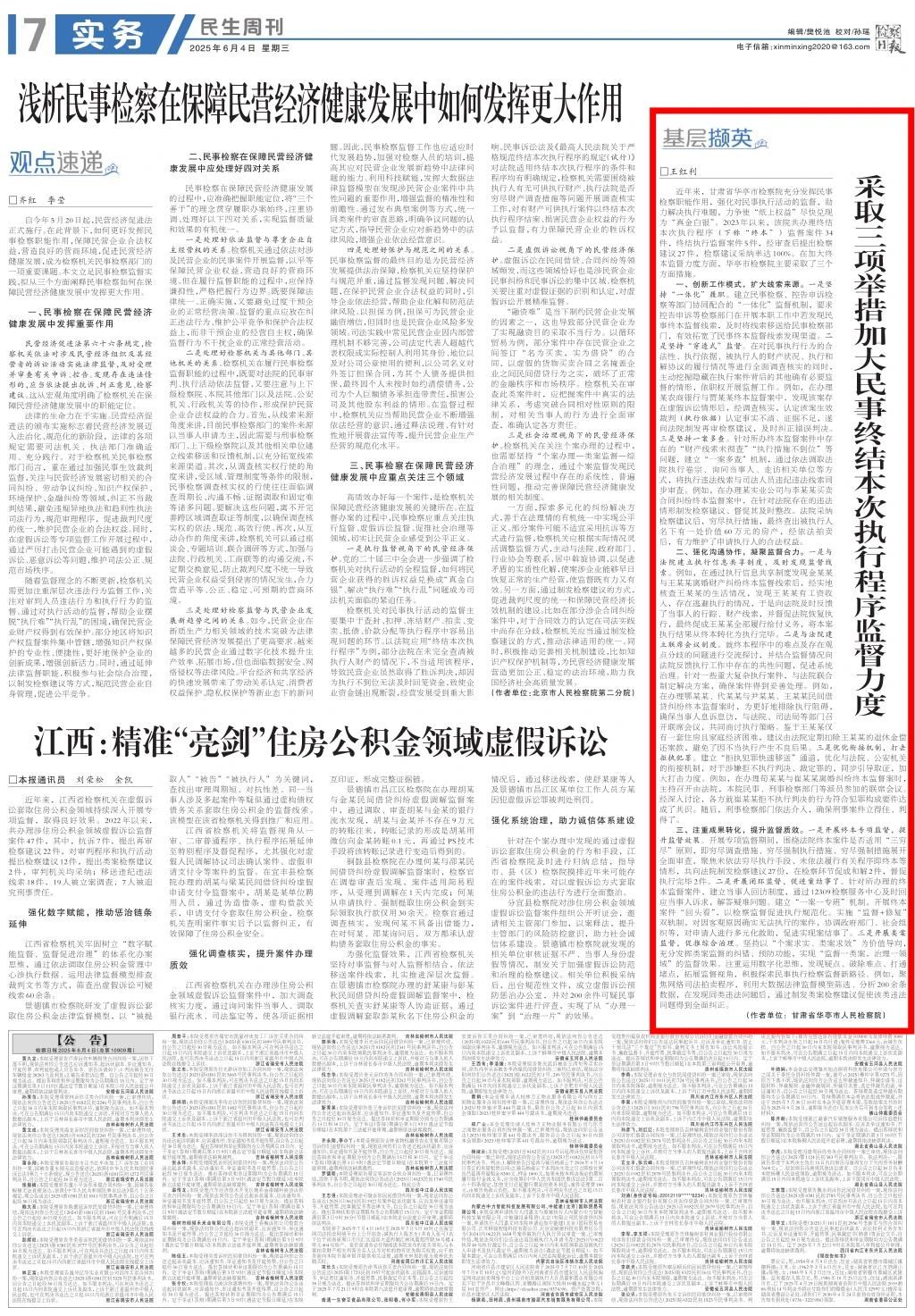 2025年6月4日,检察日报民生周刊实务版刊发《采取三项举措加大民事终结本次执行程序监督力度》。