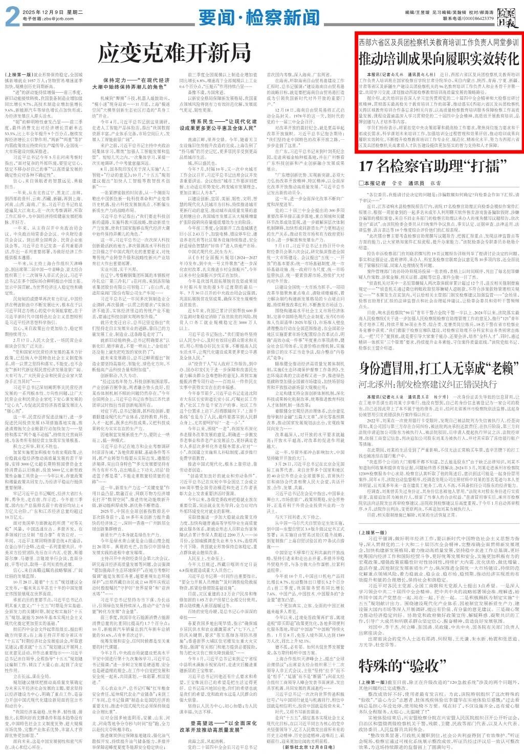 2025年12月9日,检察日报刊发《西部六省区及兵团检察机关教育培训工作负责人同堂参训 推动培训成果向履职实效转化》。