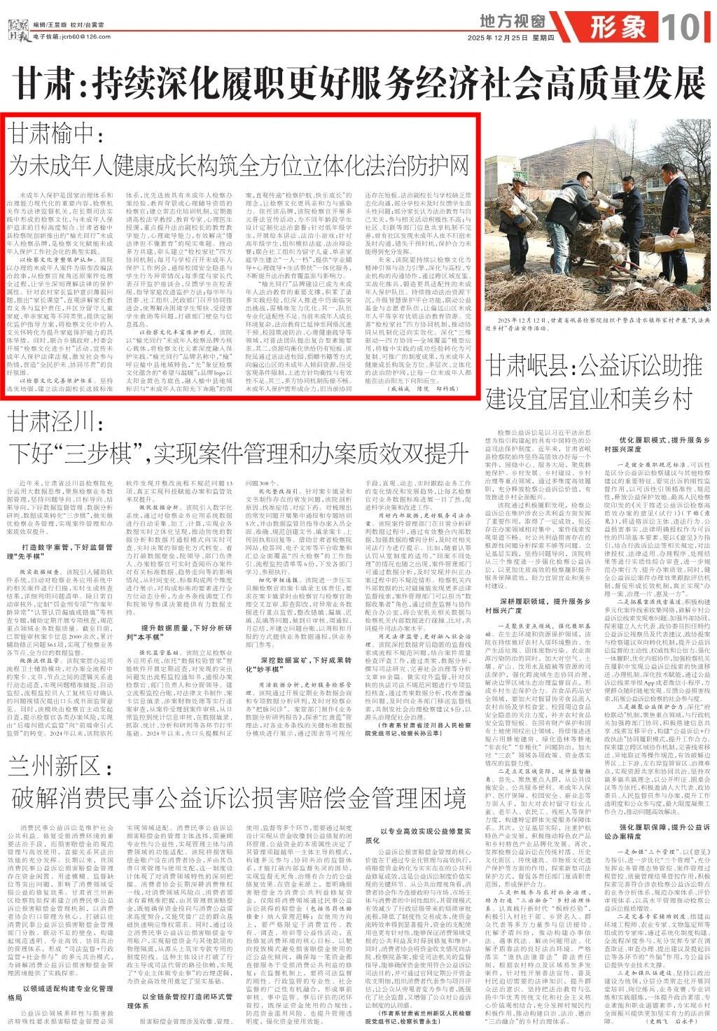 2025年12月25日,检察日报地方视窗《甘肃:持续深化履职更好服务经济社会高质量发展》专版刊发《甘肃榆中:为未成年人健康成长构筑全方位立体化法治防护网》。