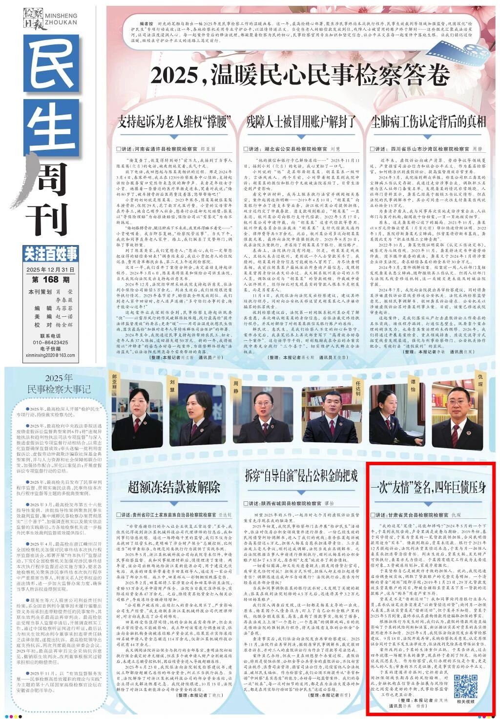 2025年12月31日,检察日报民生周刊《2025,温暖民心民事检察答卷》刊发《一次“友情”签名,四年巨债压身》。