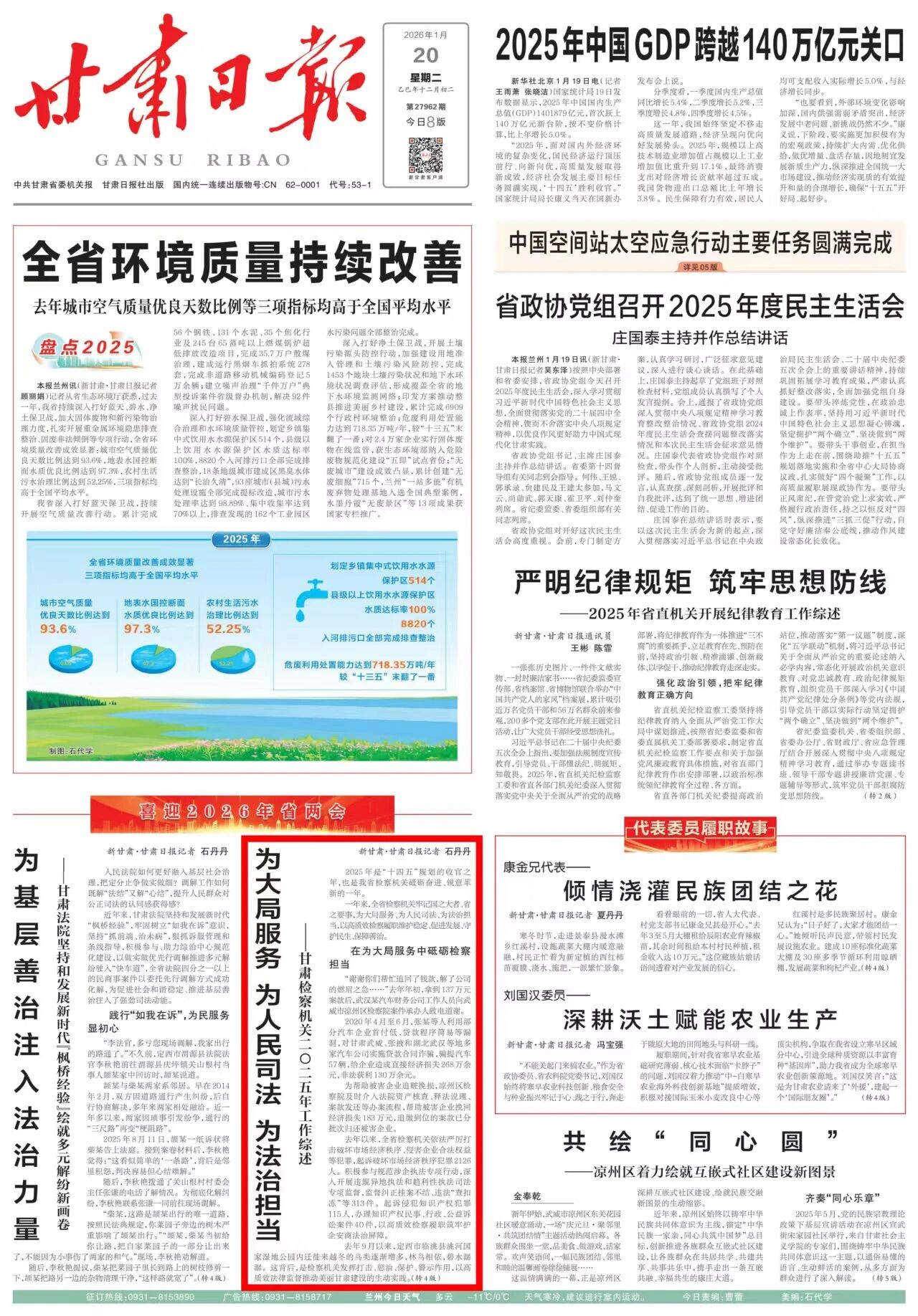 2026年1月20日,甘肃日报头版《喜迎2026年省两会》专栏刊发《为大局服务 为人民司法 为法治担当——星欧娱乐