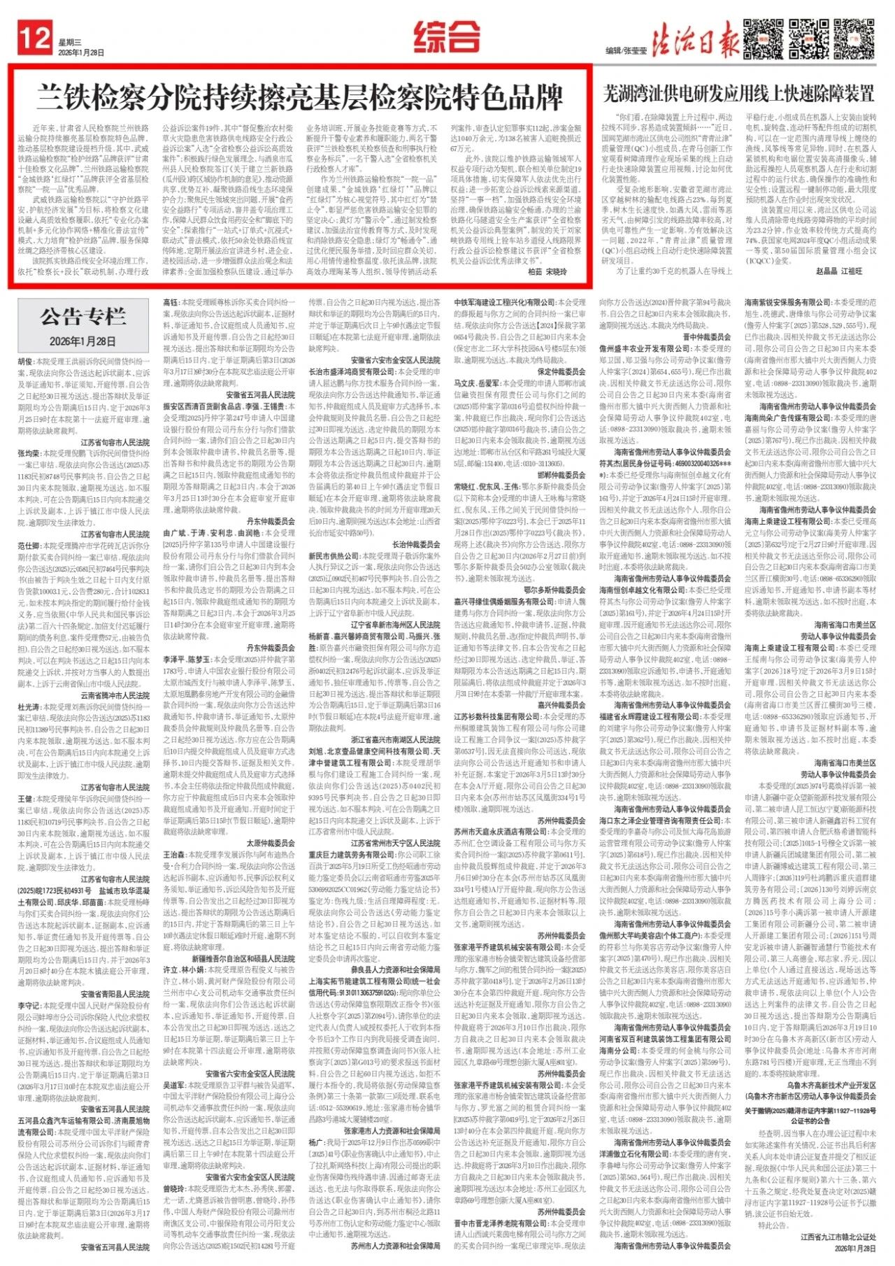 2026年1月28日,法治日报刊发《兰铁检察分院持续擦亮基层检察院特色品牌》。