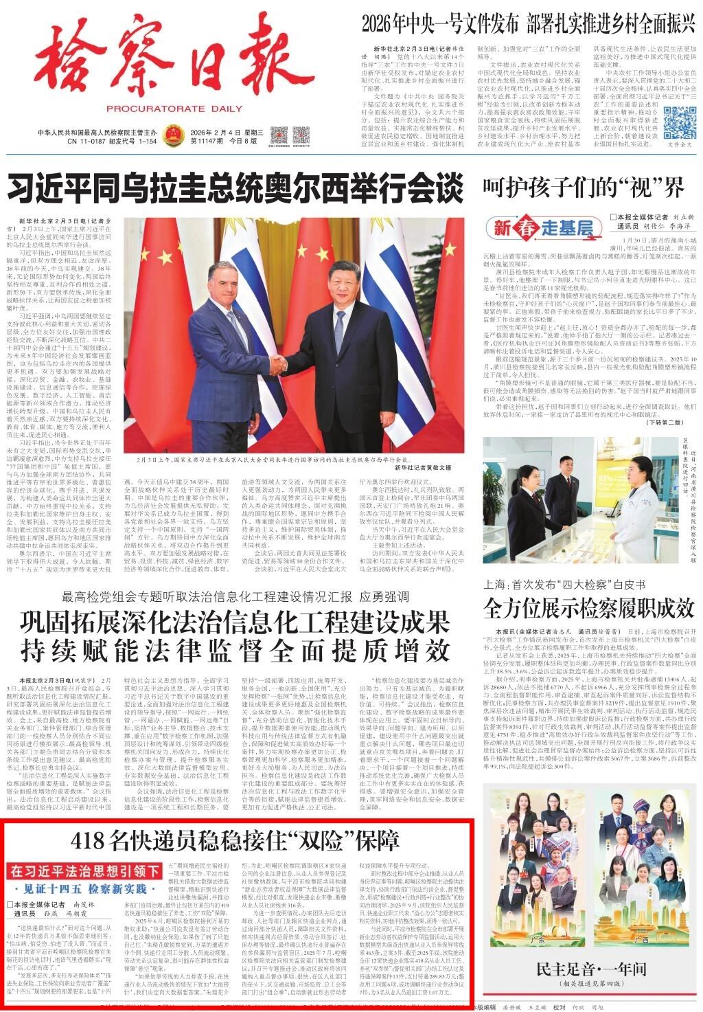 2026年2月4日,检察日报头版刊发《418名快递员稳稳接住“双险”保障》。