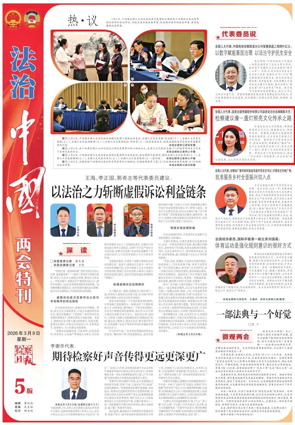 2026年3月9日,检察日报《法治中国两会特刊》专栏刊发《全国人大代表、读者出版传媒股份有限公司读者杂志社总编辑陈天竺:检察建议像一盏灯照亮文化传承之路》。