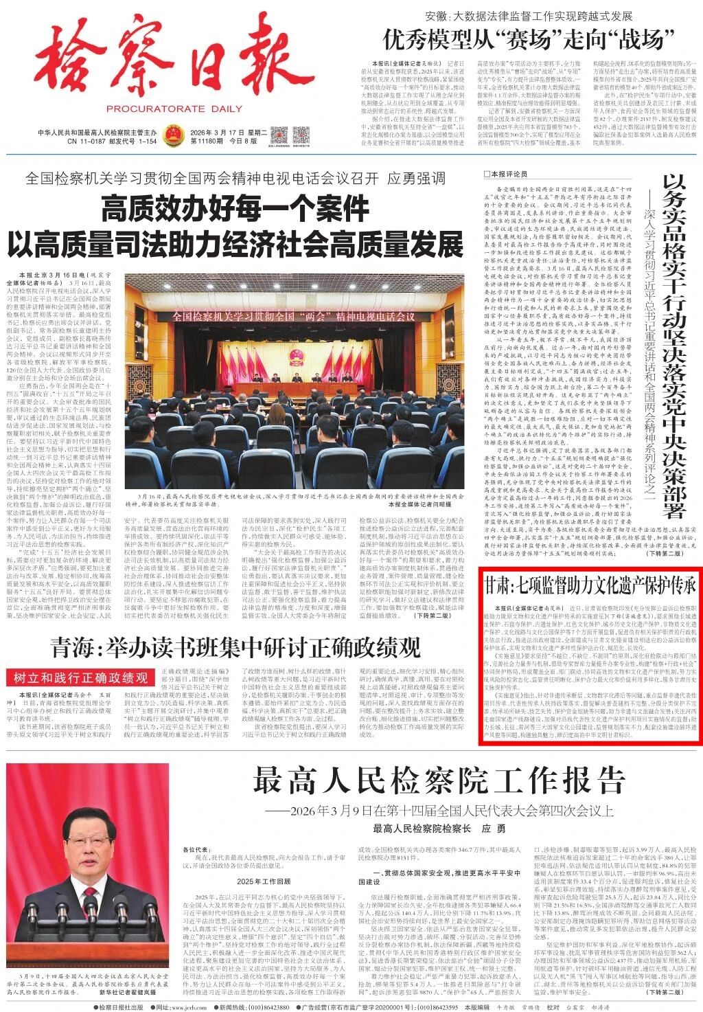 2026年3月17日,检察日报头版刊发《甘肃:七项监督助力文化遗产保护传承》。