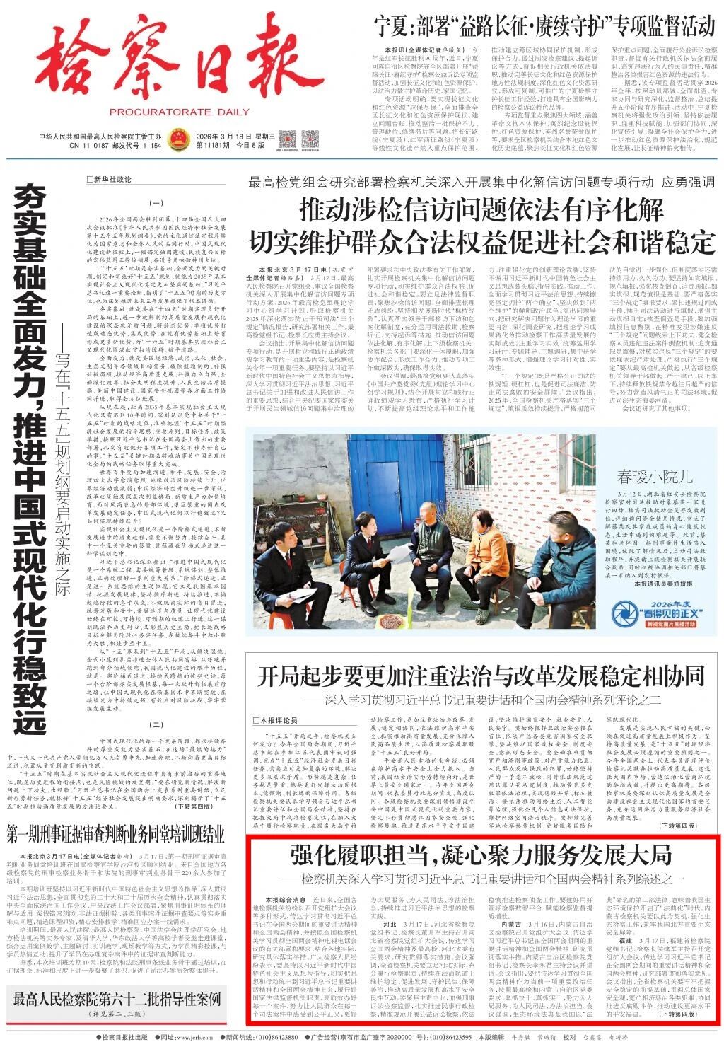2026年3月18日,检察日报头版刊发《强化履职担当,凝心聚力服务发展大局——检察机关深入学习贯彻习近平总书记重要讲话和全国两会精神系列综述之一》。