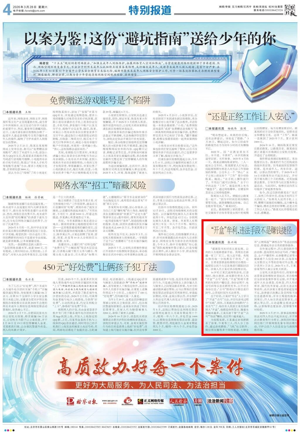 2026年3月28日,检察日报刊发《“开盒”牟利,违法手段不是赚钱捷径》。