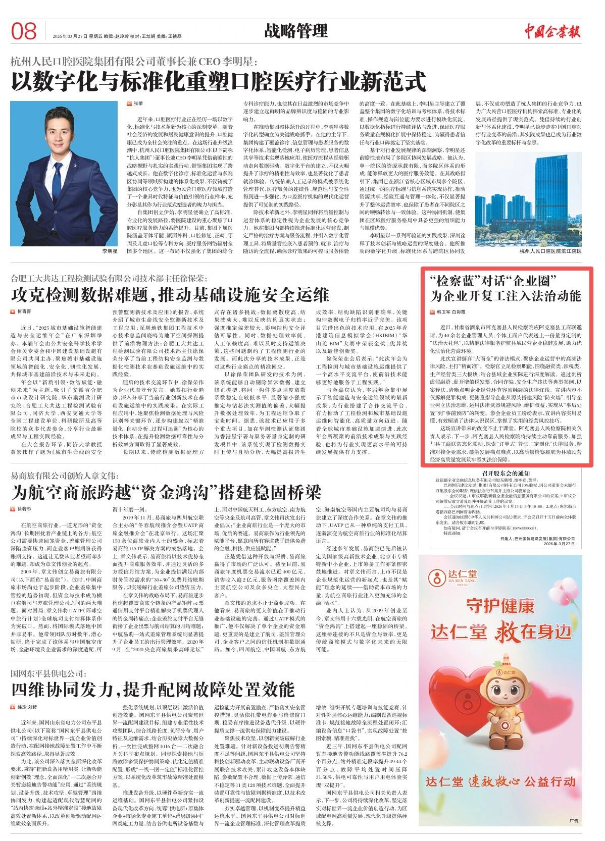 2026年3月27日,中国企业报刊发《“检察蓝”对话“企业圈” 为企业开复工注入法治动能》。
