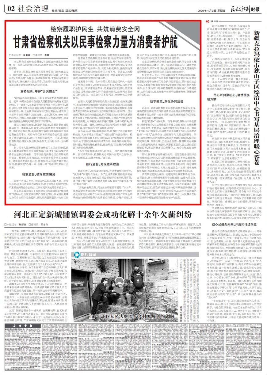 2026年4月3日,民主与法制时报刊发《检察履职护民生 共筑消费安全网 甘肃省检察机关以民事检察力量为消费者护航》。