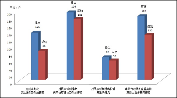 刑事检察“求极致”,更加注重彰显公平正义,以个案公正引领社会公正。批准逮捕各类犯罪嫌疑人9664人,提起公诉27417人,同比分别上升47.4%、28.1%。监督立案、撤案739件,追捕、追诉漏犯1094人,纠正侦查活动违法2753件,同比分别上升20.8%、44.9%和131.9%。提出抗诉125件,法院已改判、发回重审86件。全覆盖开展监狱、看守所巡回检察,做好全国社区矫正巡回检察试点工作,监督纠正了监狱罪犯死亡处理不规范等问题。